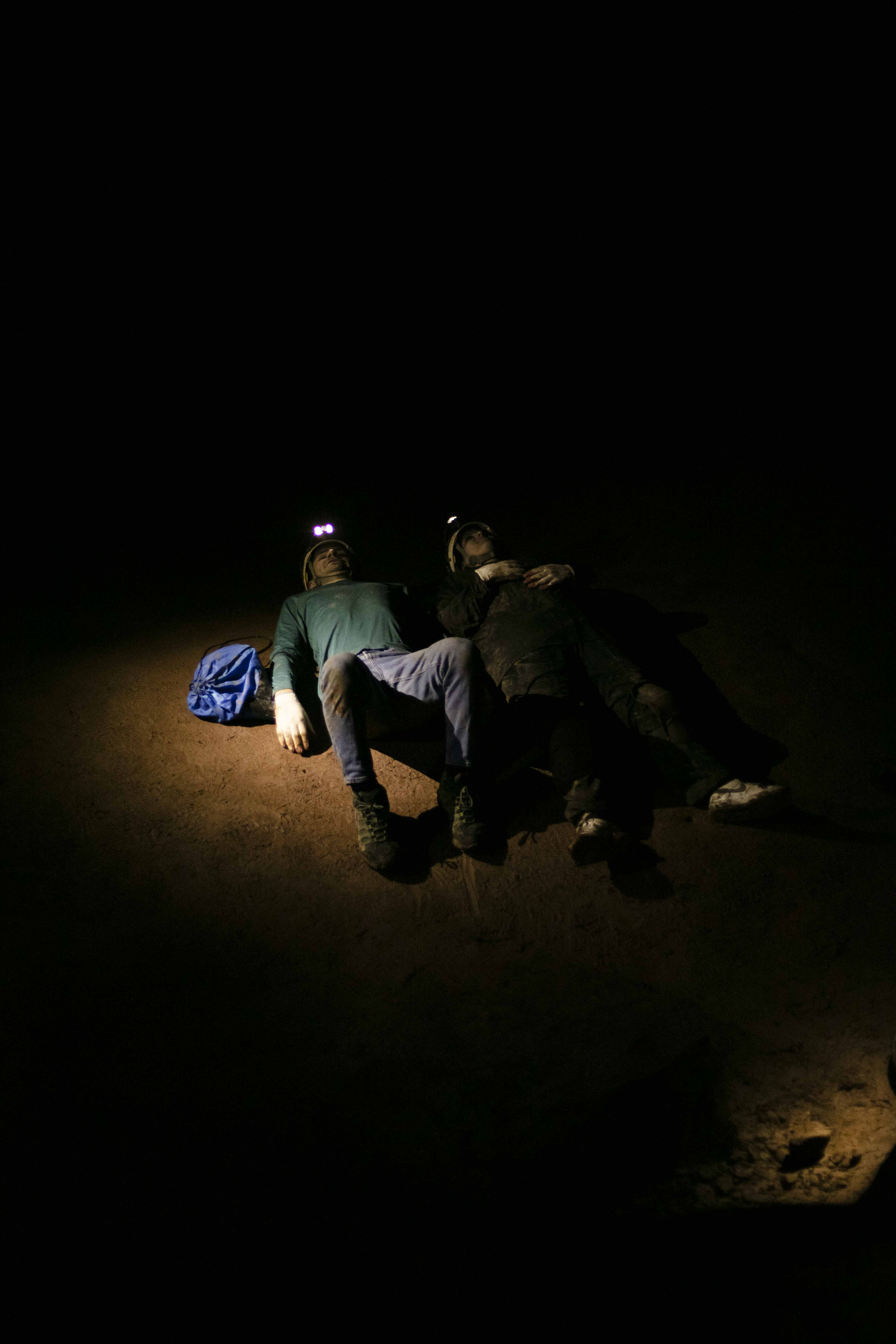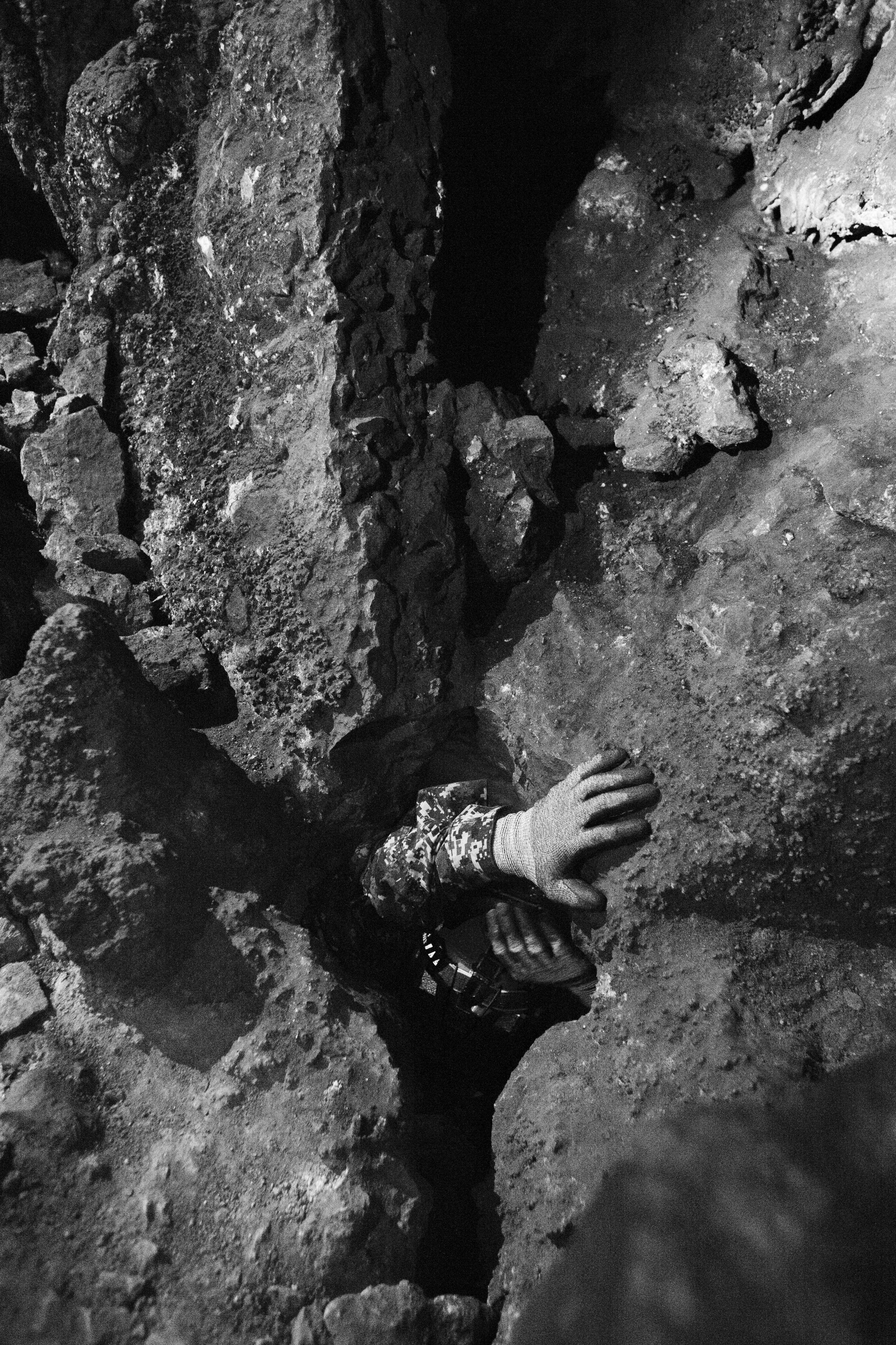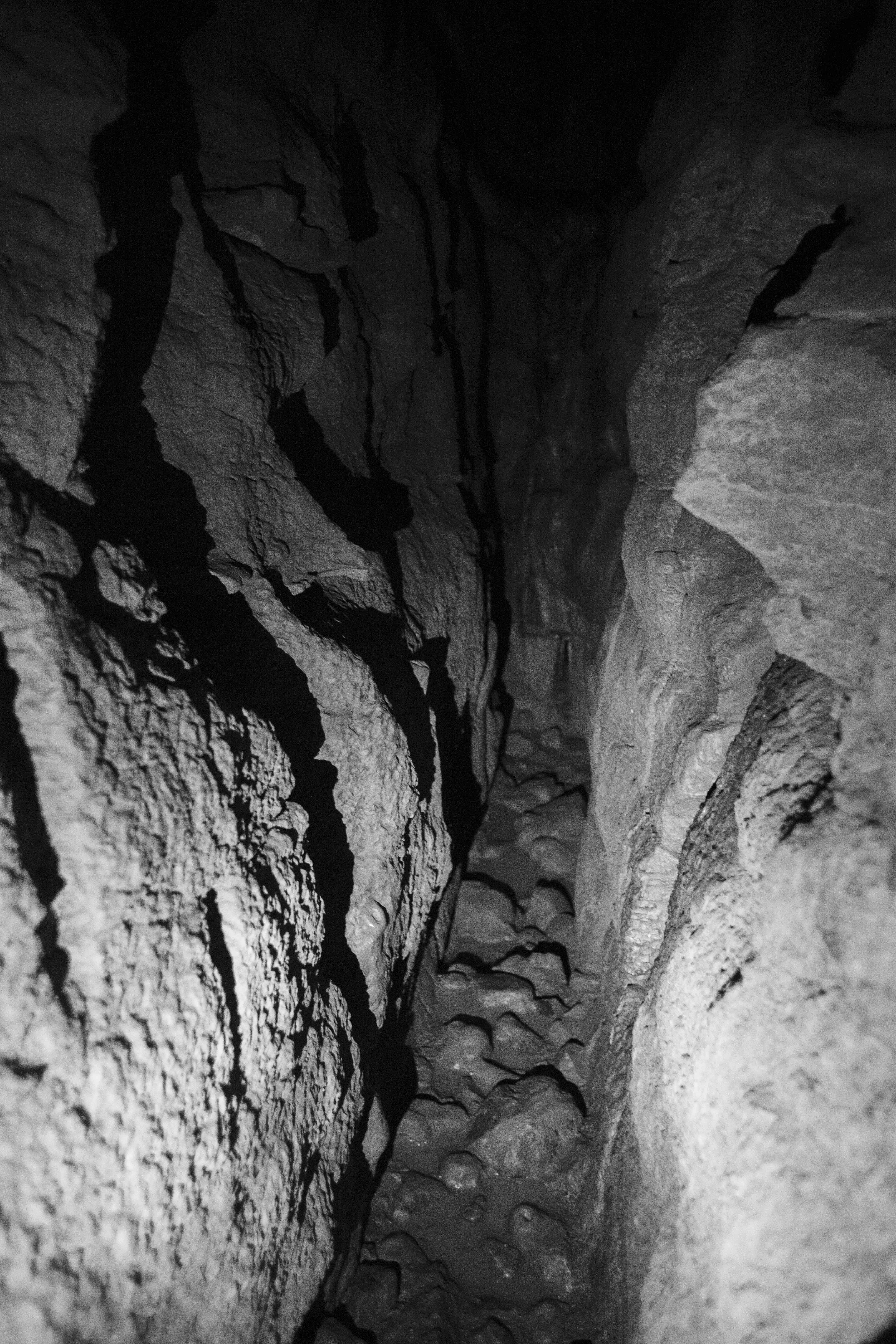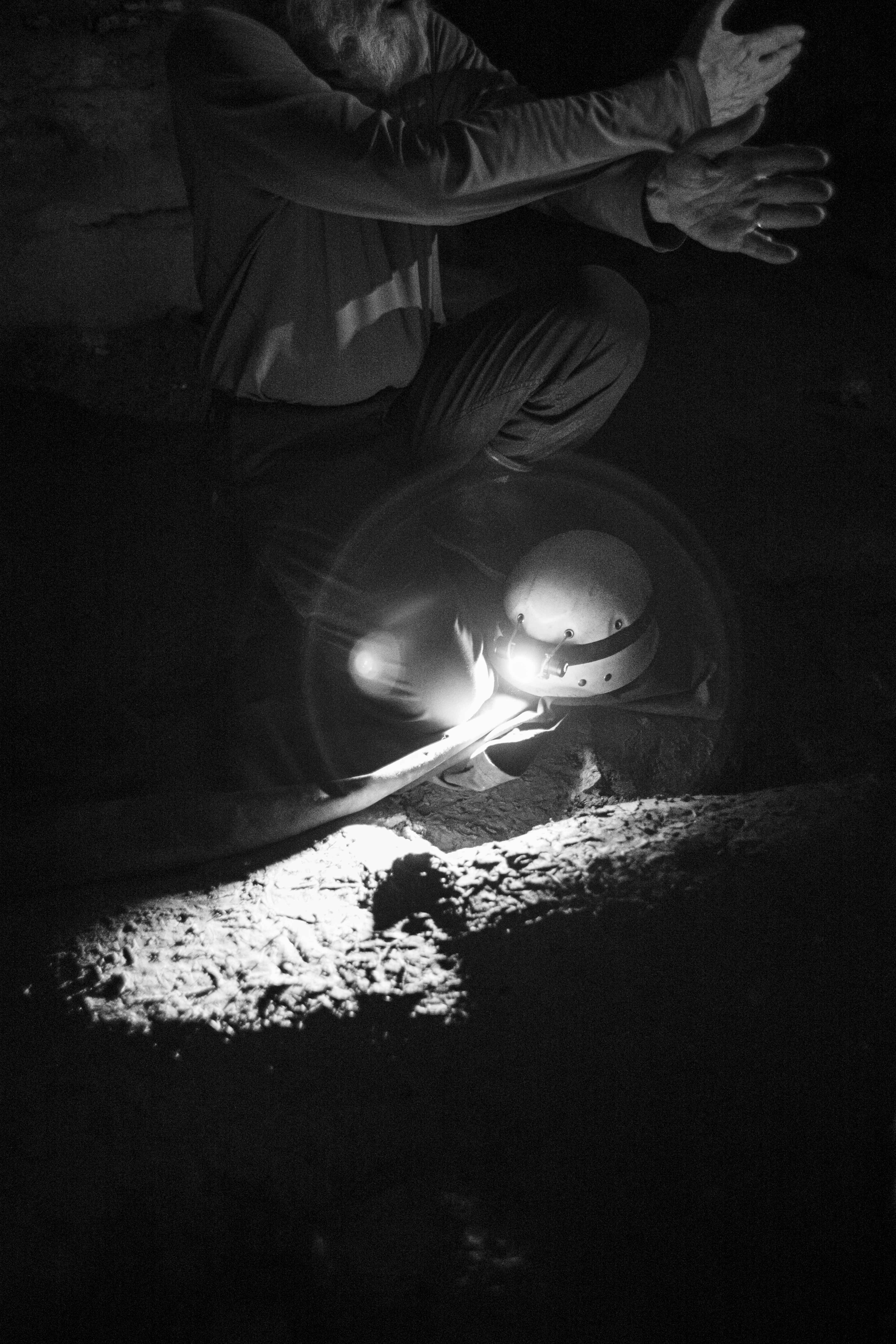 People flock to the NRQZ because of a very specific kind of quiet, a quiet that provides clarity and the ability to cut through noise. I began visiting the area with my local caving club in pursuit of that quiet. It is a frontier of the sublime. My aim in making a body of work in/under/about the zone is not meant to be merely analytical, but initiatory. The approach is a kind of split between above/below: documentary coverage of surveying projects in various cave systems (emphasis on figure study; the headlamp beam and contorted, crawling body as a visual device), and of the telescopes/sky/those who live around them.